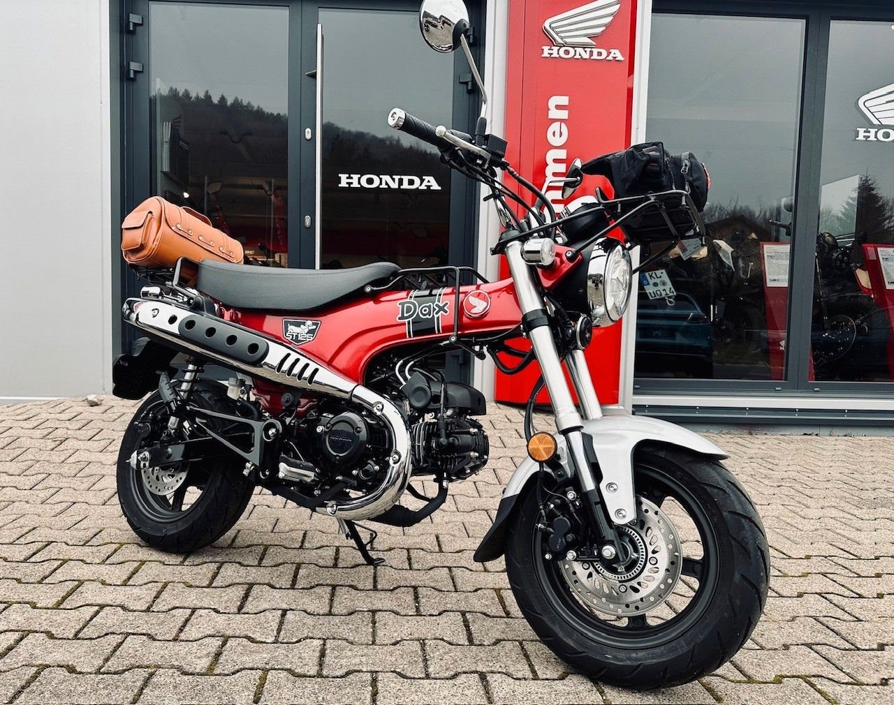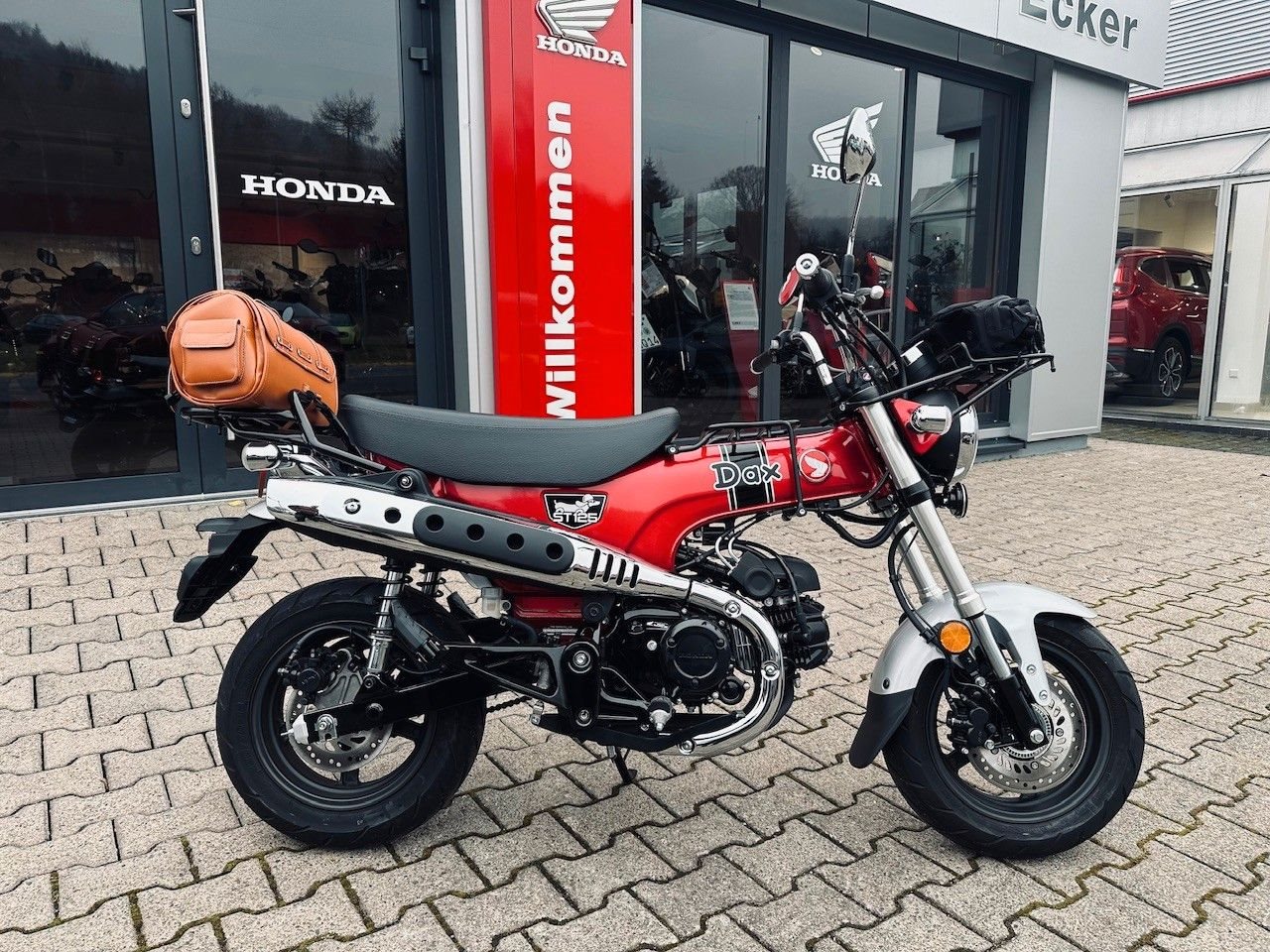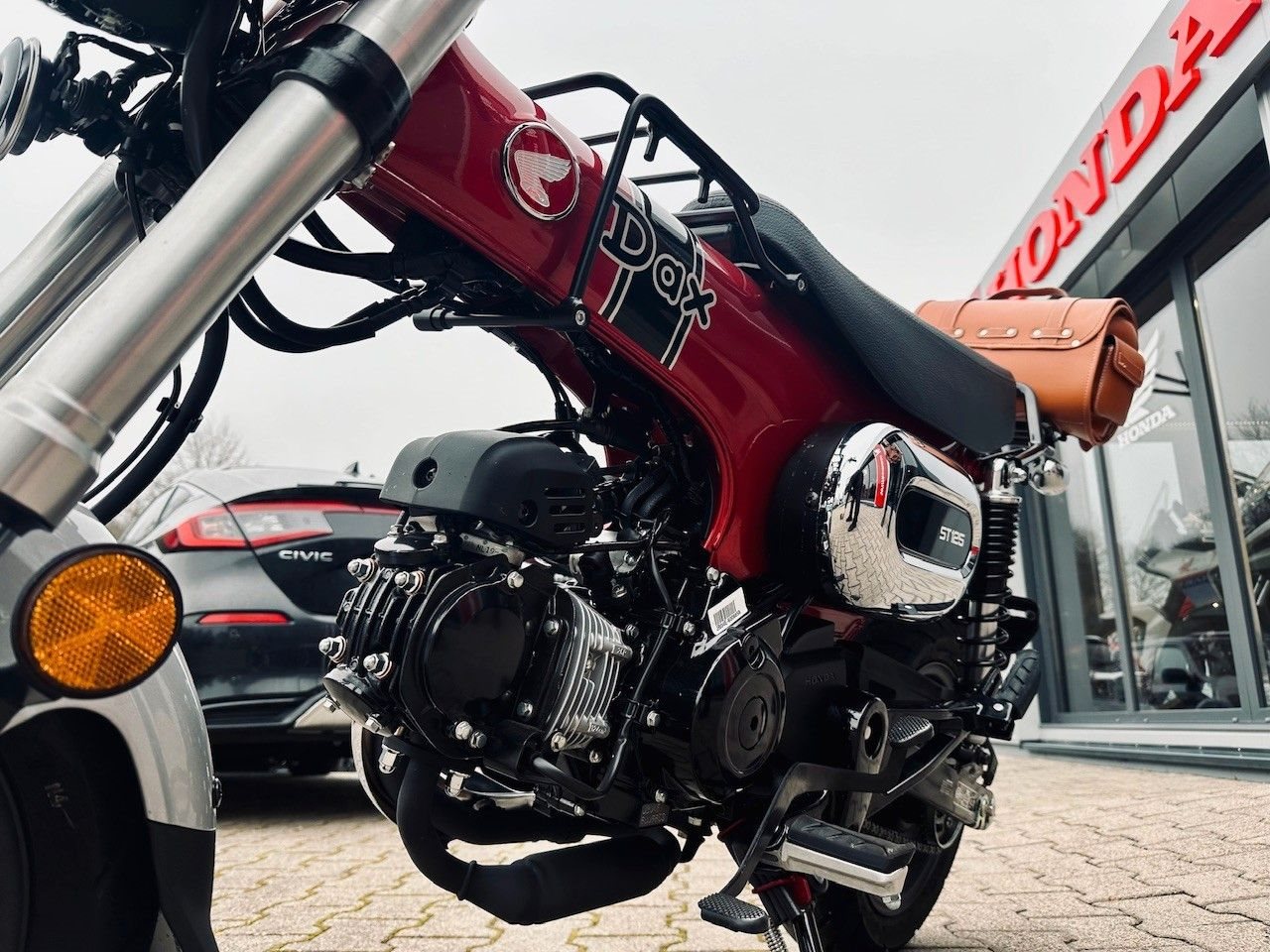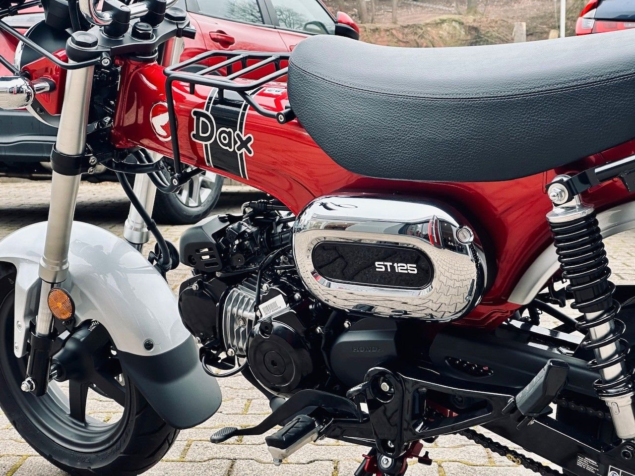 Genau aus diesem Grund ist die Dax wieder da. Sie ist ein echtes Kind der 1960er-Jahre und was sie damals so gut gemacht hat - kompakte Abmessungen, drehfreudiger Motor und leichte Lenkung - ist heute nur noch besser. Wir haben ihr mehr Leistung mitgegeben sowie den Rahmen, das Fahrwerk und die Bremsen verbessert - beim Wesentlichen bleibt jedoch alles beim Alten: Die Dax macht einfach Spaß.Das robuste wie elegante Mini-Motorrad wurde technisch auf den Stand des 21. Jahrhunderts gebracht. Das unverwechselbare, charmante Design bleibt jedoch bis ins kleinste Detail erhalten, vom hohen Mini-Ape-Lenker und dem nach oben weisenden, Offroad-inspirier- ten Auspuff bis hin zur Doppelsitzbank mit einer Höhe von nur 775 mm. Das hochwertige Fahrwerk mit Upside-Down-Vorderradgabel und Zwillingsstoßdämpfern hinten vermittelt ein angenehmes Fahrgefühl, ebenso wie die breiten Reifen mit perfektem Grip bei unterschied- lichsten Bodenverhältnissen. Das Ein-Kanal-ABS reguliert die Bremskraft der hydraulischen Bremssättel vorn und hinten.Der luftgekühlte 124-cm3-Motor ist langlebig und laufruhig. Die Spitzenleistung beträgt 6,9 kW (9,4 PS) bei einem Drehmoment von 10,8 Nm. Sie sorgt für dynamische Beschleunigung im Stadtverkehr und eine angenehme Reisegeschwindigkeit von 90 km/h zu zweit. Außerdem ist der Motor mit 1,5l/100 km (Messwerte gemäß WMTC) sehr sparsam im Verbrauch. Die Flieh- kraftkupplung macht einen Kupplungshebel überflüssig - einfach Gas geben und losfahren. Geschaltet wird zwischen den vier Gängen per Fußhebel, das System übernimmt dabei die gesamte Arbeit.