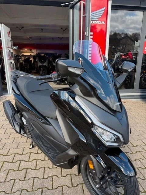 Seit seinem Debüt 2015 ist der Forza 350 dank kompakter Abmessungen und hervorragender Motorleistung führend in seiner Klasse. Dieser Roller gleitet mit Leichtigkeit durch die Stadt und ist mit Premiumtechnologie ausgestattet, die Fahrgefühl und Alltagskomfort weiter voranbringt. Front- und Seitenverkleidung sind besonders auf Aerodynamik getrimmt und optimieren den Fahrtwind auch bei höherer Geschwindigkeit. Der elektrische Flyscreen lässt sich um 180 mm verstellen und erzeugt ausgefahren erhöhten Windschutz und weniger Windgeräusche bzw. eingefahren mehr Freiraum in der Stadt. Zum Aufladen eines Mobilgerätes befindet sich im Handschuhfach eine praktische USB-Type-C-Ladebuchse.Der flüssigkeitsgekühlte Vierventilmotor mit enhanced Smart Power Plus (eSP+) erfüllt die Euro-5-Norm und ist mit der Honda Selectable Torque Control (HSTC) ausgestattet, die für die Traktion des Hinterrades zuständig ist. Die Start-Stopp-Automatik steigert die Kraftstoffeffizienz (Reichweite bis zu 487 km / Tankfüllung) und reduziert Emissionen, indem sie den Motor nach drei Sekunden Standzeit abschaltet und mit einem Dreh am Gasgriff wieder startet. Stecken Sie den SMART Key einfach ein. Bei Annäherung an das Fahrzeug schaltet er automatisch die Zündung sowie alle zum System gehörenden Schlösser, z. B. an Lenker, Tankdeckel, Sitzbank oder am SMART Top Case, frei. Der Forza 125 hat ein attraktives neues LCD-Display und Platz für zwei Helme unter dem Sitz. Effiziente Voll-LED- Beleuchtung bedeuten eine deutliche Präsenz auf der Straße und sehr gute Sichtbarkeit.Der